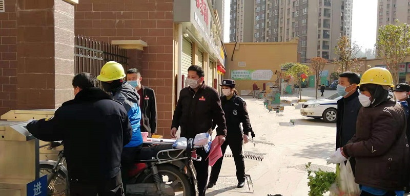 肖忠良經(jīng)理在小區(qū)入口管制人員和車輛
